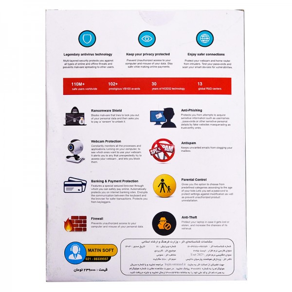 نسخه 2025 | 4 کاربره (دو کاربر کامپیوتر و دو کاربر اندروید) | از بین برنده هرگونه تهدید شامل ویروس و ... | مقاومت در برابر هکرها جهت پیشگیری از کنترل کامپیوتر توسط آنها | بالا بودن سرعت اسکن | جلوگیری از دسترسی غیرمجاز | حجم 280 مگابایت | پشتیبانی 12 ماهه | ناشر و پشتیبانی اثر پردازش هوشمند پارسیان داتیس