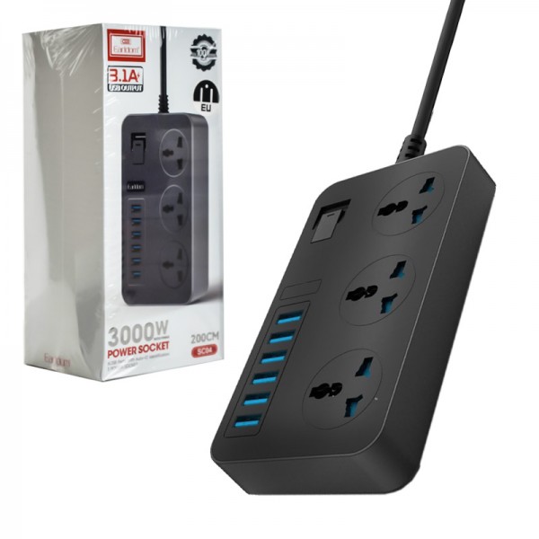 گارانتی 6 ماه تست | طول کابل 200 سانتی متر | شش پورت USB-A | سه ورودی برق EU | جریان 3.1 آمپر | فست شارژ | 3000 وات | مقاوم در برابر شعله حرارت تا دمای 750 درجه سانتی گراد | دارای کلید ON/OFF | جنس PC+PVC flame retardant