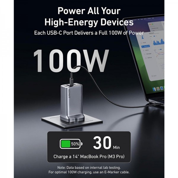 یکی دیگر از ویژگیهای جذاب این شارژر، سیستم مدیریت هوشمند توان است. بهطور مثال، زمانی که تنها یکی از پورتهای USB‑C در حال استفاده باشد، خروجی کامل 100 وات ارائه میشود. اما در صورت استفاده همزمان از دو یا سه پورت، توان به شکل هوشمند میان آنها تقسیم میشود تا همه دستگاهها بهصورت ایمن و متناسب با نیازشان شارژ شوند. این موضوع بهخصوص برای افرادی که همزمان لپتاپ و گوشی یا ساعت هوشمند خود را شارژ میکنند بسیار کاربردی است. انکر حتی برای این تقسیم توان، الگوریتمهایی خاص را طراحی کرده که موجب افزایش بازده و کاهش استهلاک دستگاهها میشود.